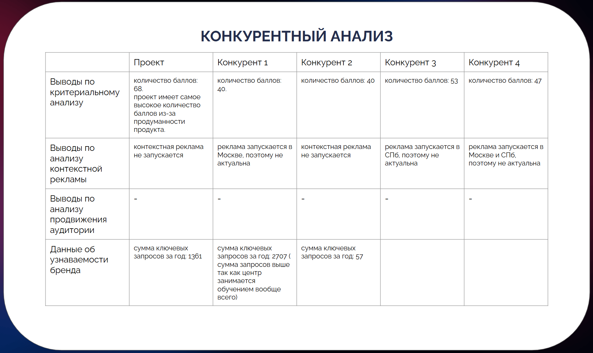 Выводы: проект имеет хорошую репутацию и комплектацию продуктов. Выявлены слабые стороны: сайт и отсутствие воронок продаж