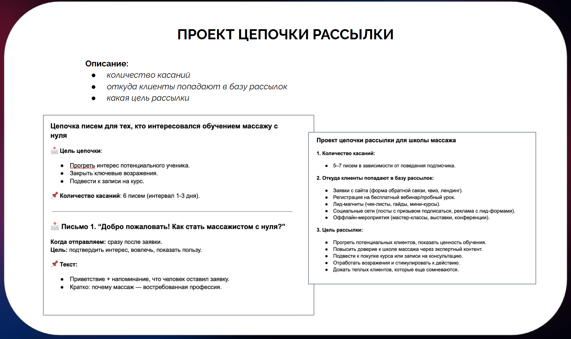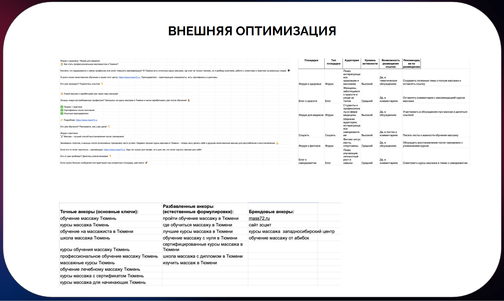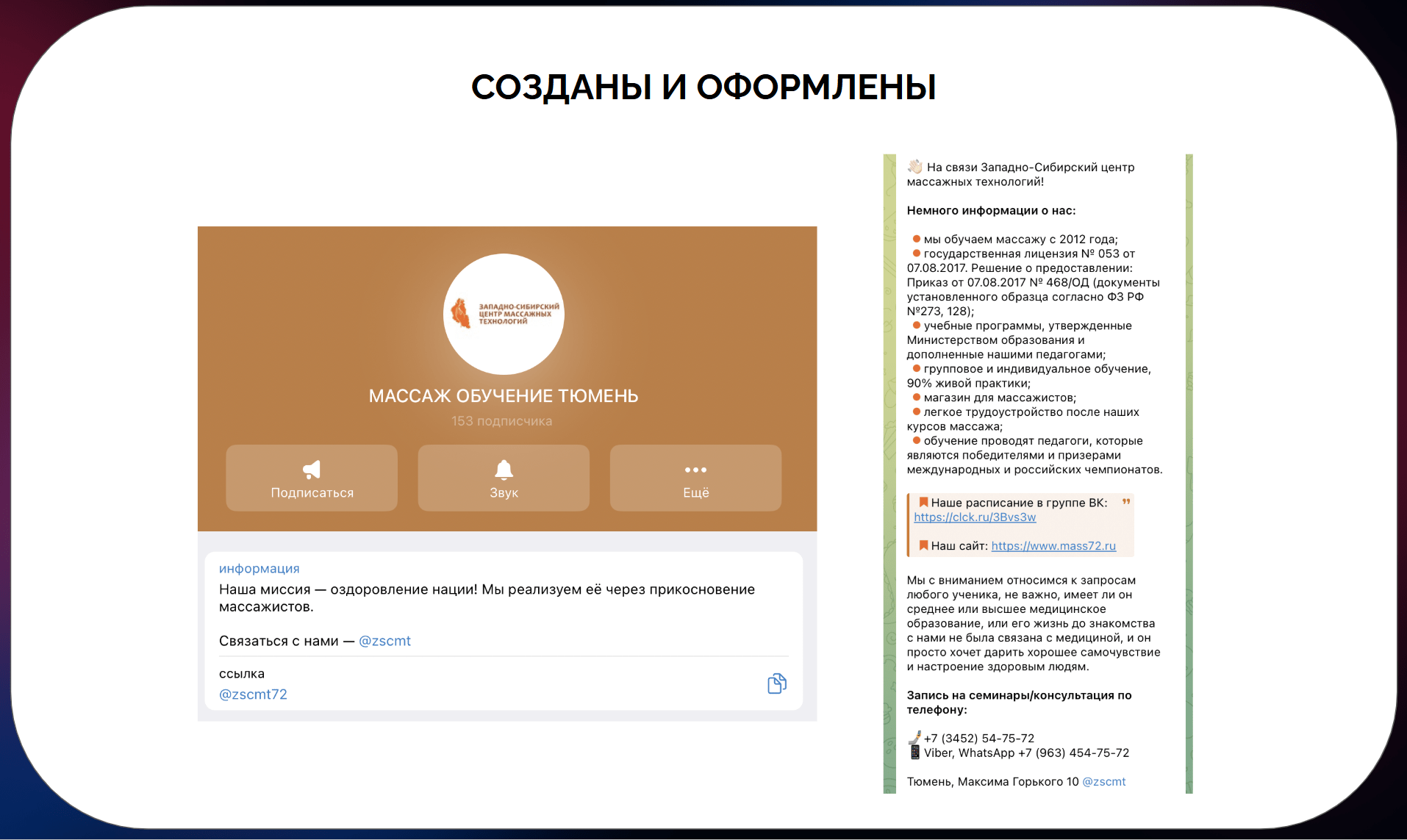 - Развитие YouTube-канала с полезными видео (разборы техник массажа, истории успеха учеников).