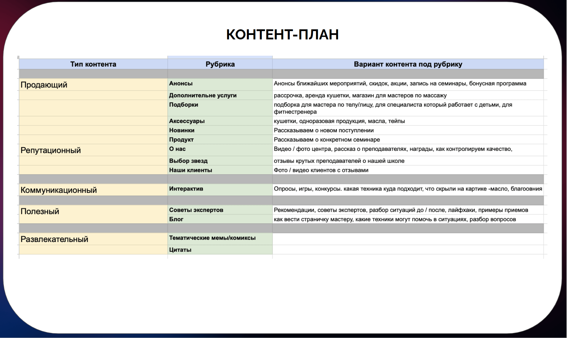 Используют 2 социальные сети: ВК и Инст* - в которых дают только анонсы и отзывы. Среднее количество человек на семинарах - 8 человек