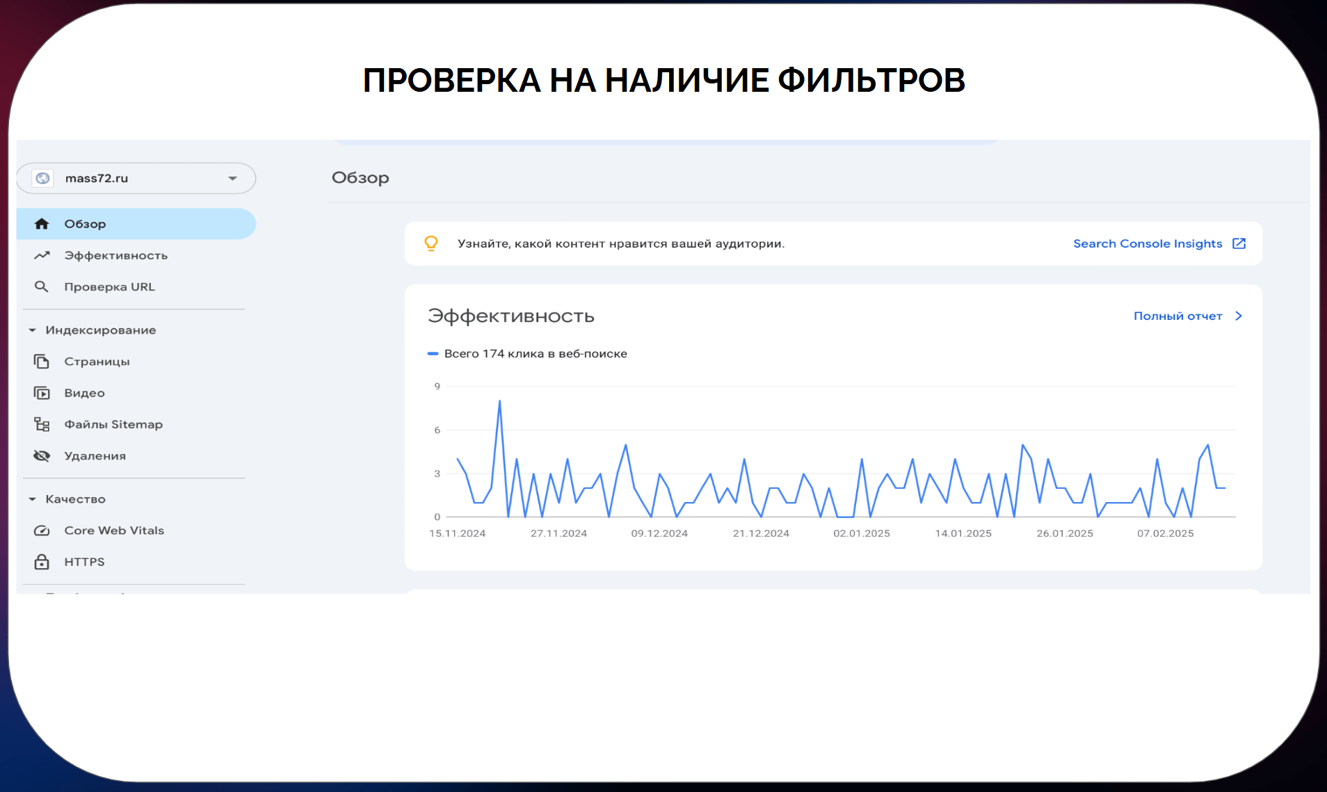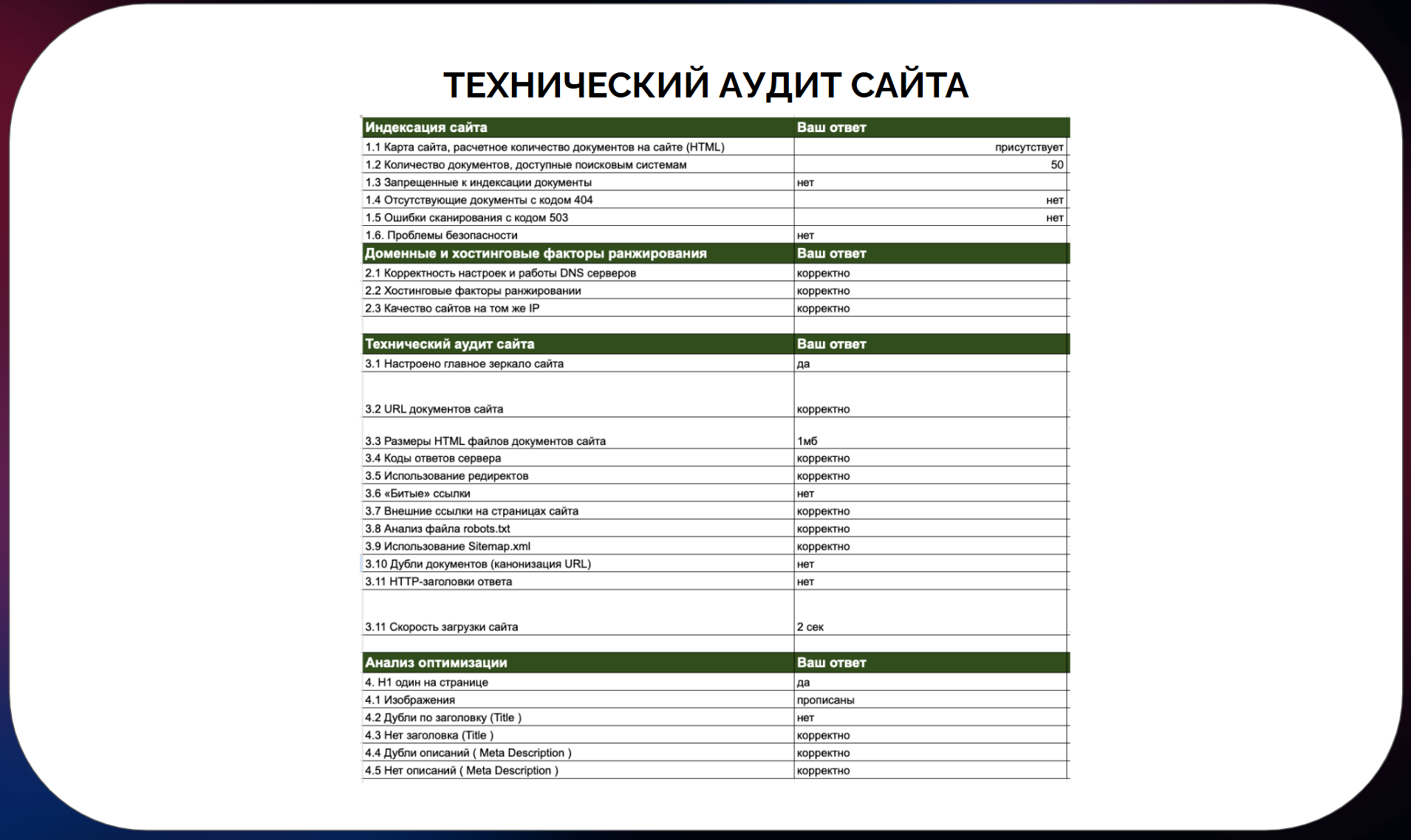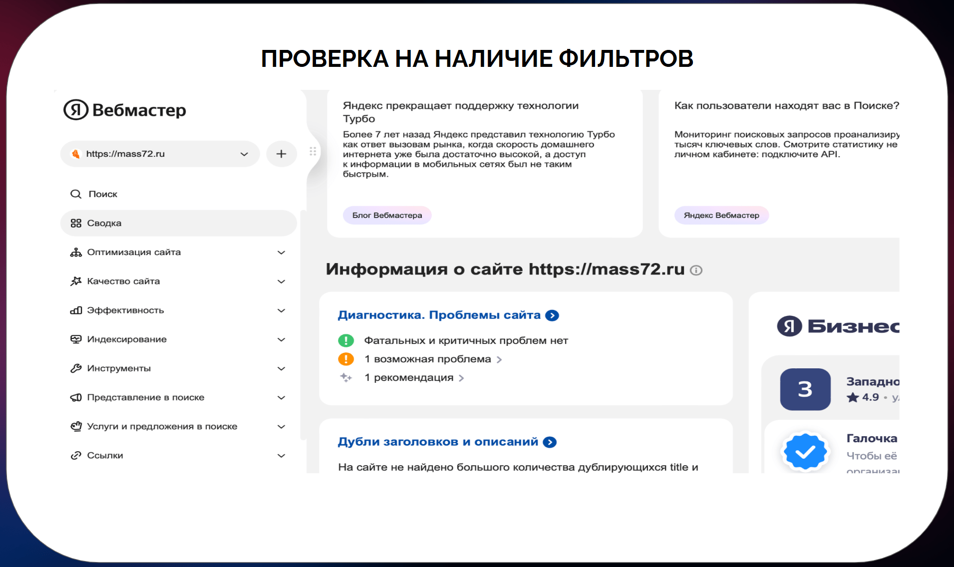 Сайт работает корректно. Собирался с нуля мной. Учла все показатели и применила теорию на практике