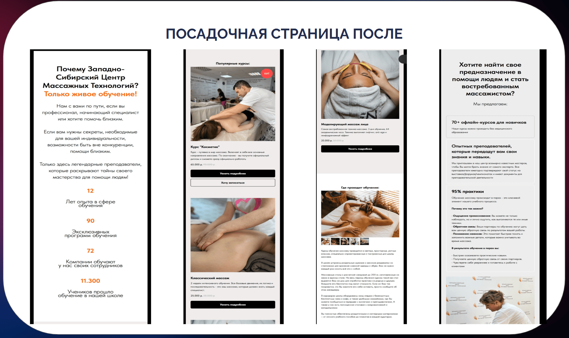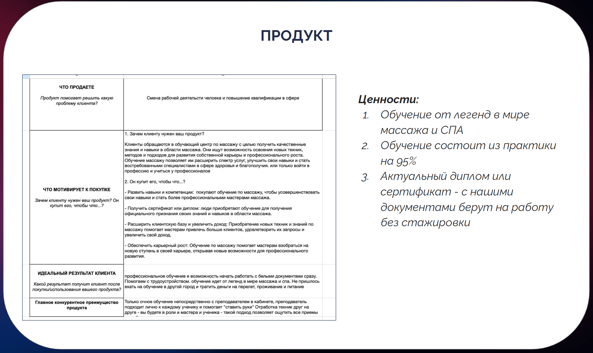 - Тестировать разные УТП: «Работа в СПА после курса», «Первые клиенты уже в процессе обучения».