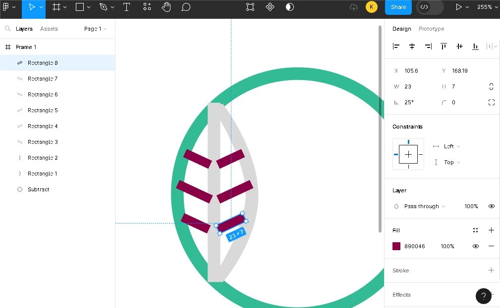 Подсказка: Каждая линия равна по ширине противоположной. Чтобы добиться этого, используйте “Копировать и вставить”. Нужно сделать наклон, в зависимости от главной линии. Справа на +25 градусов. Слева на -25 градусов. В итоге получится что-то вроде листа. Позже перекрасим все элементы в зеленый цвет.