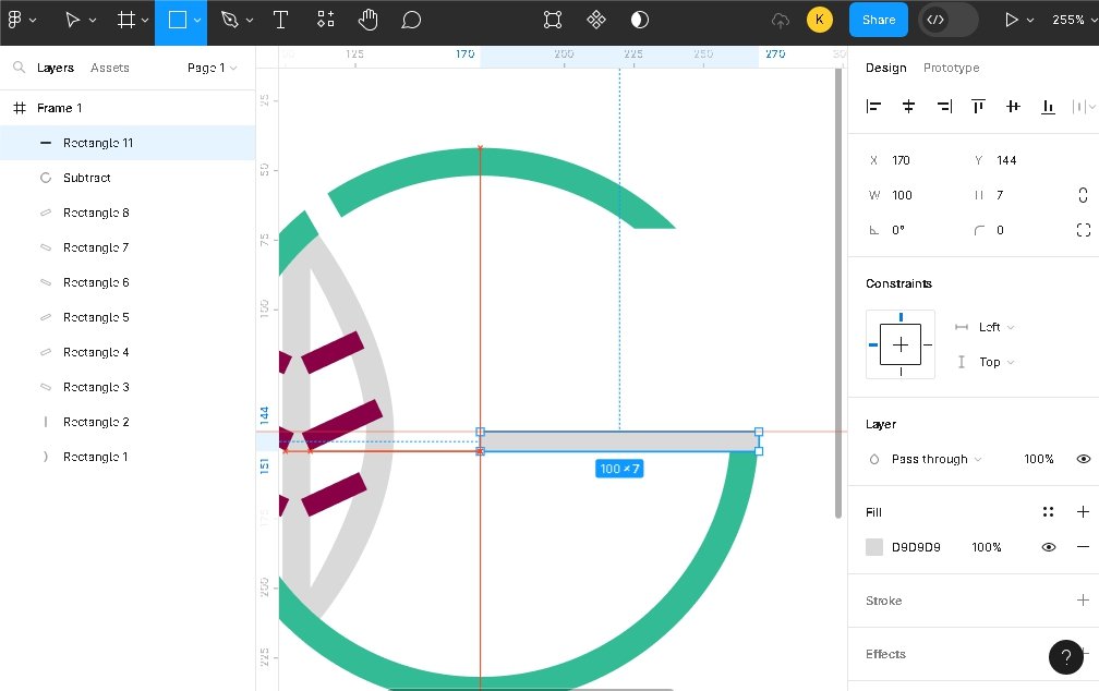 Делаем последний штрих, ниже на скриншоте видно, как Rectangle (100 на 7 пикселей) удачно расположился по отношению к центру и линейки.