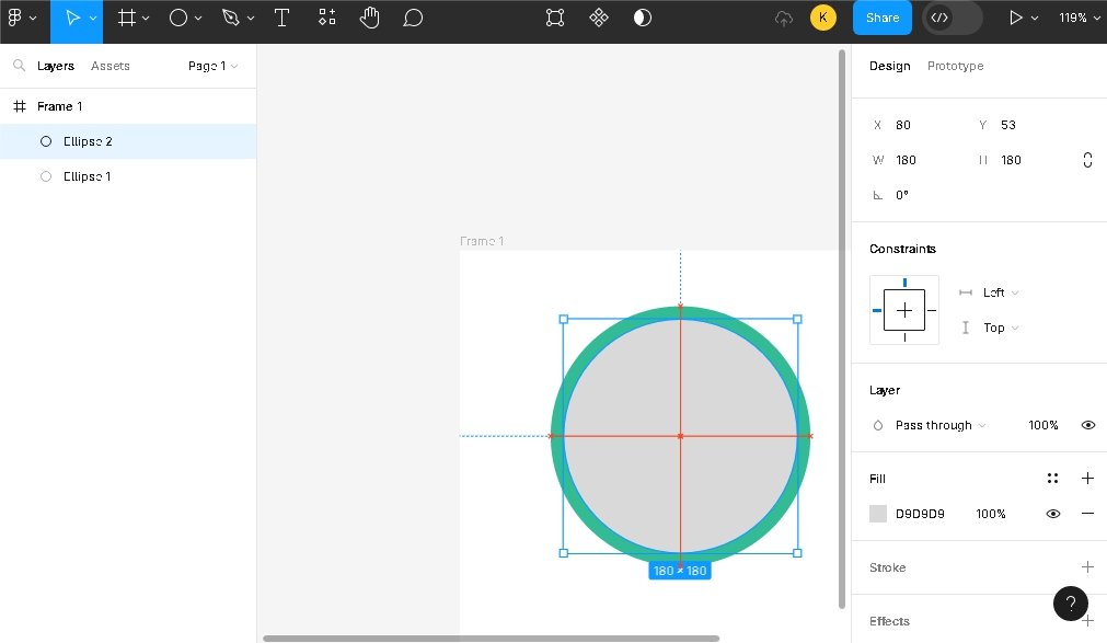 Зайдите в Figma и создайте новый документ. Добавьте в рабочую область Frame и нарисуйте на нем окружность (Ellipse). Высота и ширина: 200 пикселей. Сразу следует сделать примитив зеленым, если до этого он был другого цвета. Поверх основной окружности наложите еще один круг. Размер второго примитива поставьте 180 на 180 пикселей. Начинайте совмещать одну фигуру с другой, пока их центры не совпадут, это станет понятно, когда горизонтальные и вертикальные линии пересекутся.