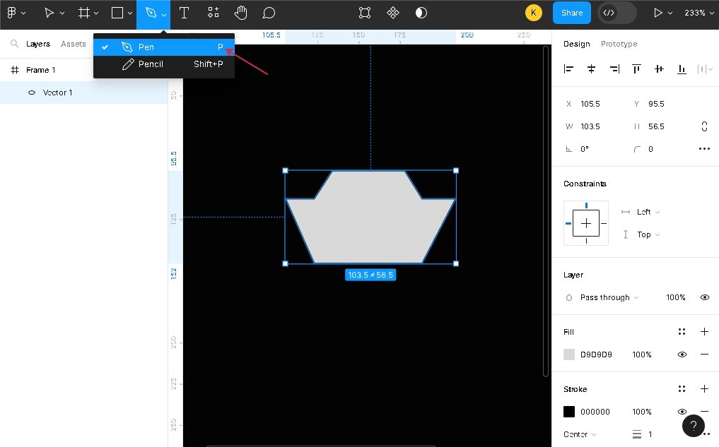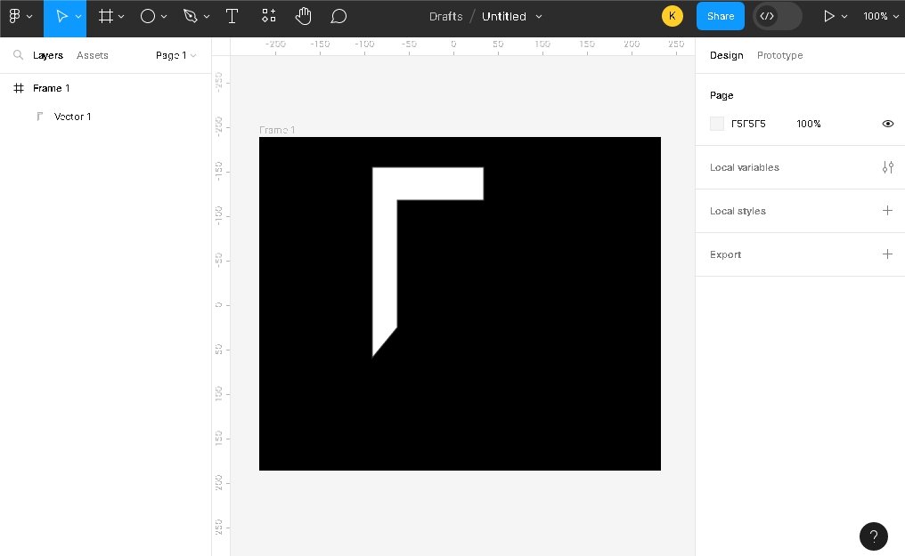 Создадим следующее лого. Для начала добавим Frame и сделаем заливку черным цветом. Нарисуем произвольную фигуру, для этого будем использовать перо. Пример на картинке.