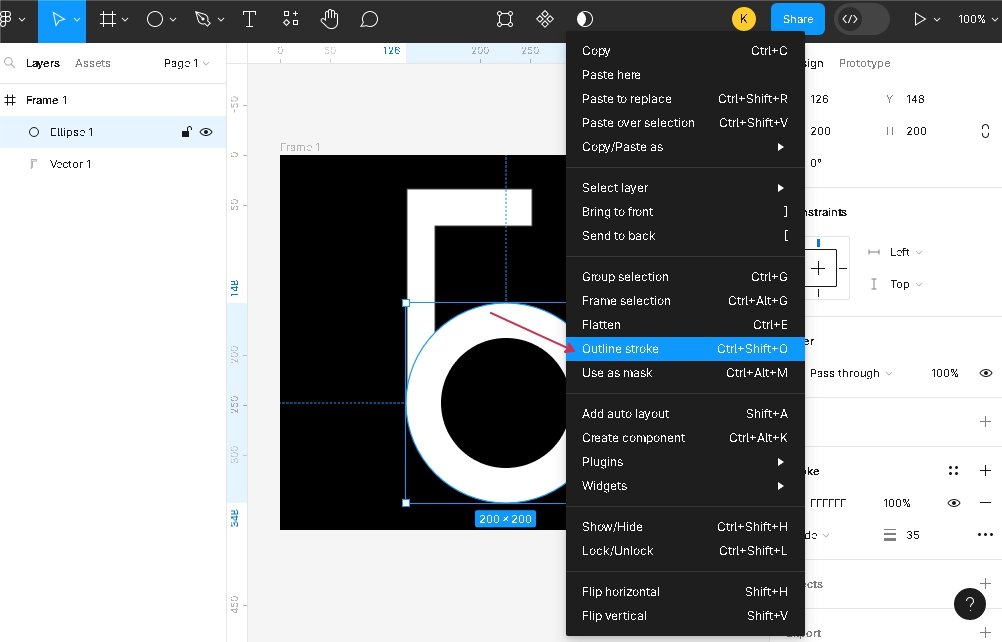 Добавим круг, который будет накладываться поверх фигуры. Удалим параметр Fill и сделаем толщину Stroke 30-35 пикселей. В меню выберем Outline Stroke. Это обязательное требование, чтобы при конвертации в вектор настройки не сбились, об этом мы писали выше. Пример выбора опции на картинке.