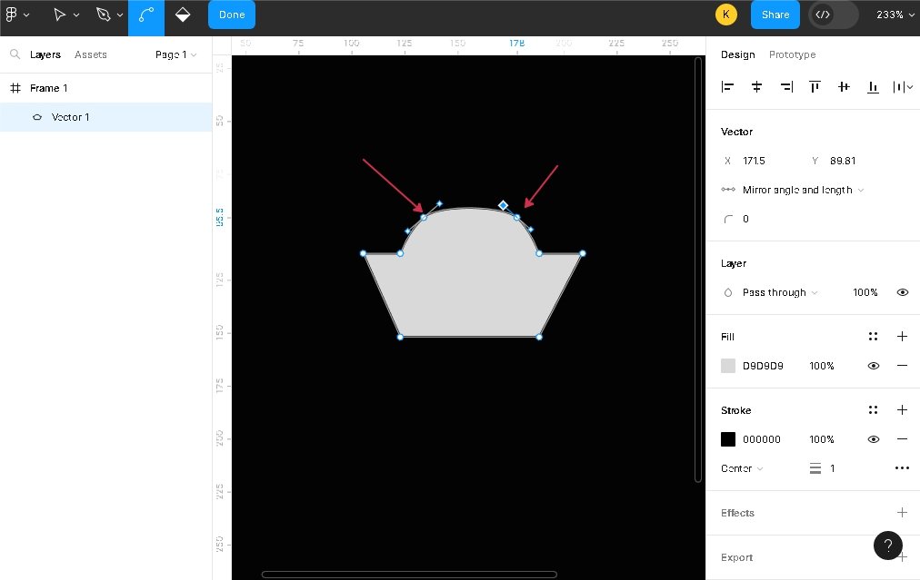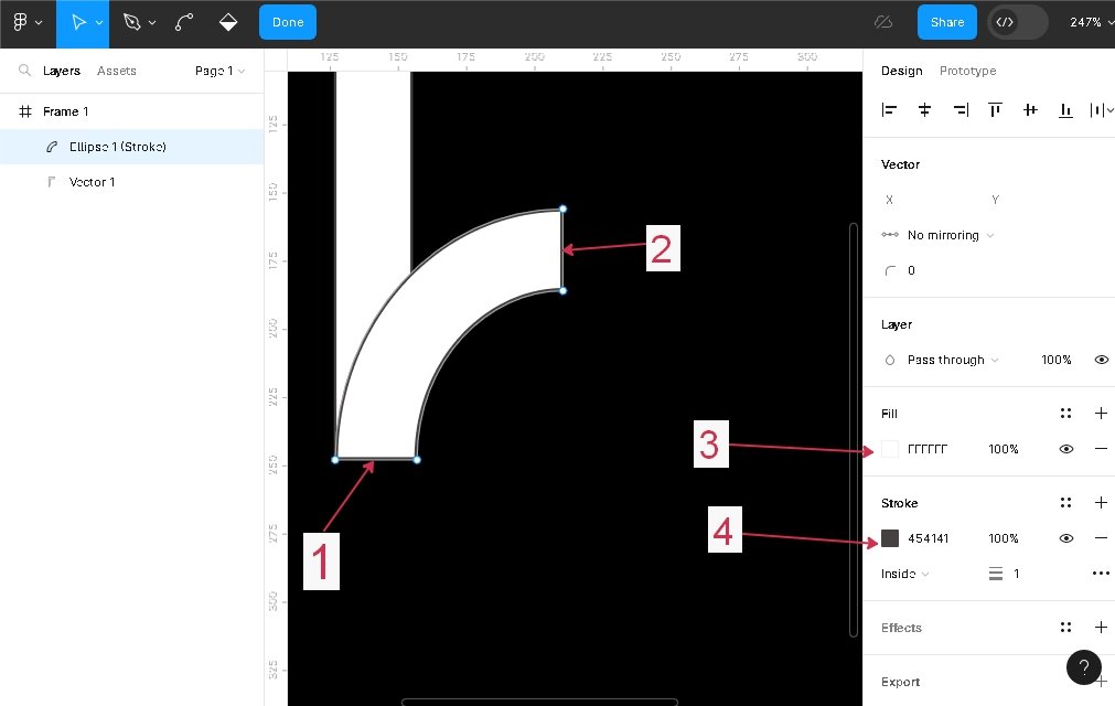 При удалении точек контур станет невидимым, чтобы убедиться, что он на месте посмотрите левую панель Layers->Ellipse1 (Stroke). После редактирования остались две изогнутые линии и четыре точки. Эти линии нужно объединить и сделать заливку Fill белого цвета, а Stroke серого, результат ниже на скриншоте.