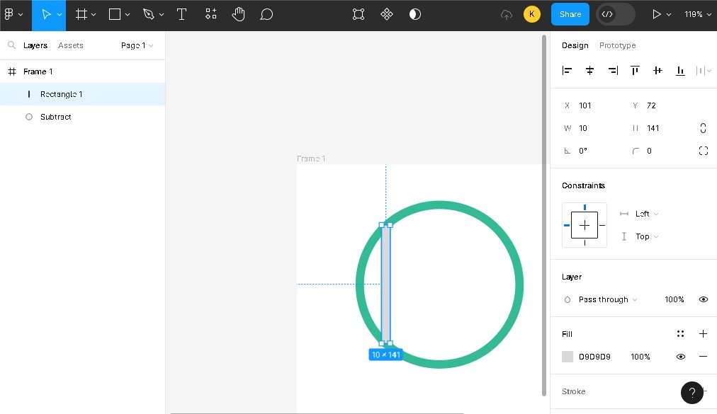 В примере взятого с фотостока, по которому мы рисуем лого, видно, что окружность нарисована не полностью, и присутствуют в некоторых местах разрывы. Сделаем то же самое. Воспользуемся снова инструментом Rectangle. Создадим брусок 10 (ширина) на 20 (высота) пикселей и разместим под углом 30 градусов на линии. Выделим круг, брусок и в панели выберем “Subtract Selection”.