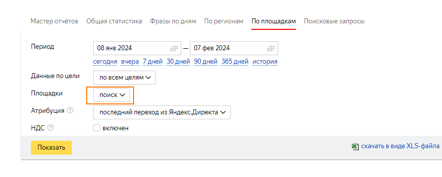 Показы объявлений поисковых кампаний Яндекс Директ идут не только на поиске Яндекса, но и на тематических площадках – например, Яндекс Картинки, Яндекс Карты, Яндекс Услуги и т.д. Чаще всего оттуда идут случайные клики, которые не несут продаж бизнесу. Для повышения эффективности рекламных кампаний на поиске данные площадки лучше отключать. Но в разных бизнесах свои показатели эффективности, поэтому, прежде чем отключать площадки, лучше заглянуть в статистику. Посмотреть данные можно в отчете «По площадкам»: