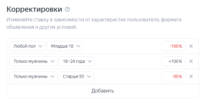 Если для вашего бизнеса важна демографическая составляющая, то повысить эффективность рекламной кампании поможет корректировка ставок по полу и возрасту.
