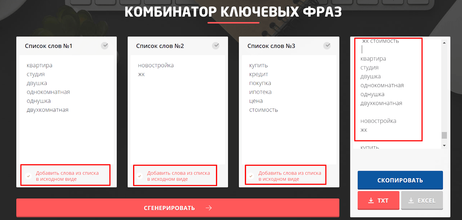 Если вы хотите дополнительно проверить запросы по отдельным словам в сервисах с автоматическим сбором семантического ядра, в комбинаторе можно поставить галочку «Добавить слова из списка в исходном виде», они автоматически добавятся в конец списка: