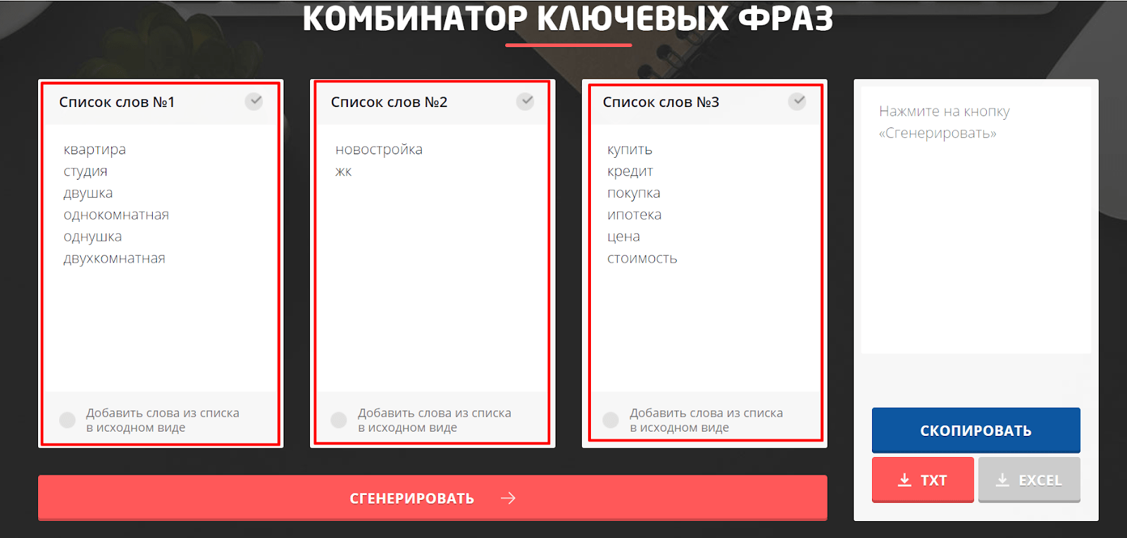 Заполните списки ключевыми словами, вы можете как вводить их вручную, так и копировать прямо из Excel-файла. Повторы и пустые строки не учитываются. На ваше усмотрение – не обязательно использовать все три столбца: