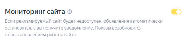 Вам не нужно постоянно мониторить работоспособность сайта и отключать объявления в случае форс-мажора – Метрика может делать это сама. При проблемах с доступом к сайту, она самостоятельно сообщает об этом в Директ. Реклама останавливается и запускается автоматически в том случае, когда сайт снова будет доступен.