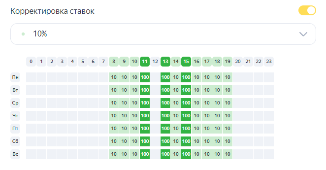 - В часы с корректировкой 10% показов практически не будет. Важно сказать, что это не 100% отключение показов – объявления всё равно иногда будут видны аудитории.