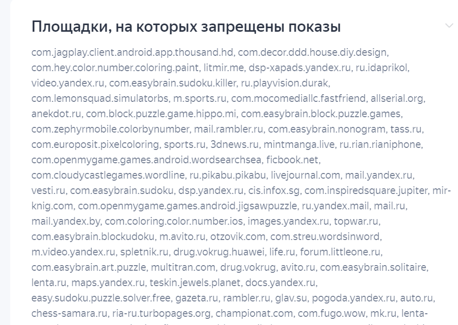 Оценивается наличие в списке всех или большей части рекламных площадок, на которых показ нежелателен, согласно стандартам работы специалистов по контекстной рекламе и полученной по итогам показа рекламы статистики.