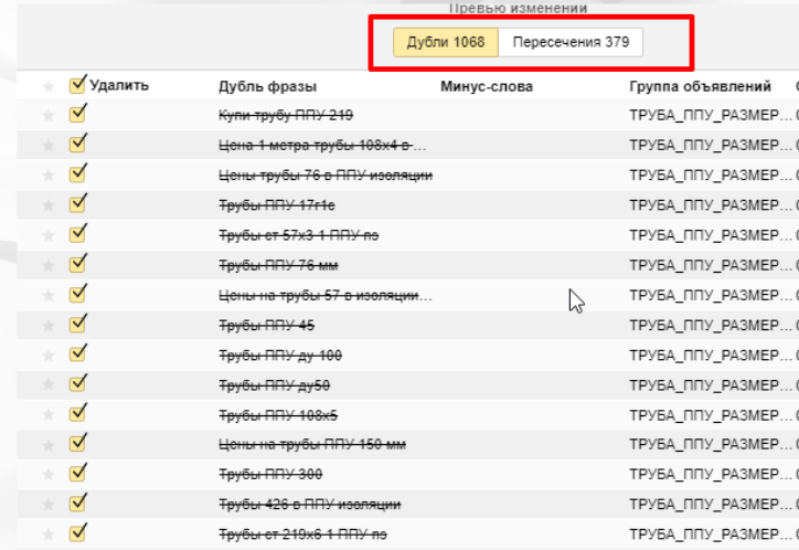 Мы смотрим, насколько полно и качественно проработано семантическое ядро, как собраны ключевые слова, много ли в них мусорных запросов. Есть ли дубли и пересекающиеся запросы. Оценивается полнота используемых в кампаниях минус-слов.