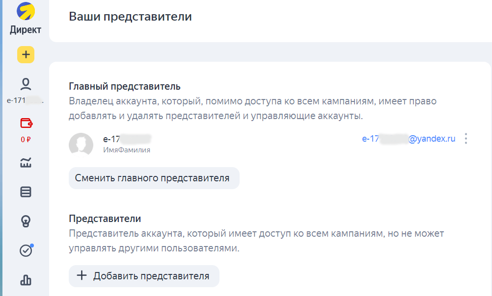 Владелец аккаунта в Яндексе, на котором созданы рекламные кампании, может создавать Представителей в Яндекс-Директе, чтобы выдать доступ именно к рекламному кабинету, сохранив безопасность данных остальных сервисов, подключенных к этому аккаунту.