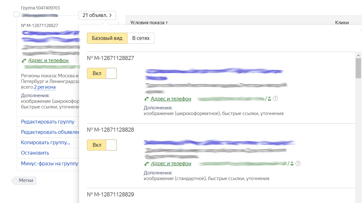 На этом этапе мы анализируем релевантность объявлений, наличие всех необходимых дополнений, быстрых ссылок, форматов, вариантов объявлений и картинок. Проверяем, нет ли отключенных объявлений по причинам не прохождения модерации или набора малого количества показов.