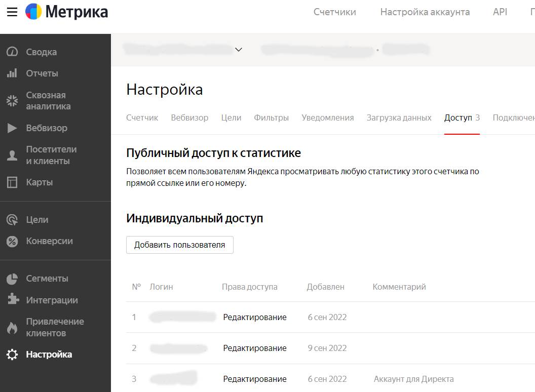 Для предоставления доступа к веб-аналитике нужно зайти на сайт metrika.yandex.ru, перейти в меню «Настройка» - «Доступ» и там добавить пользователя. Здесь тоже достаточно дать права уровня “Просмотр”.