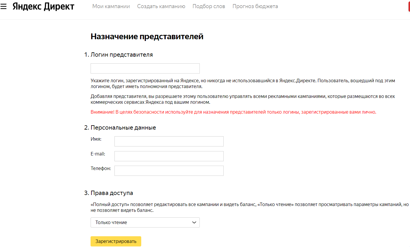 Приступим сразу к этапу создания представителя в Яндекс-Директе.