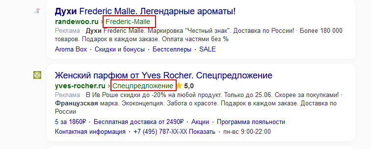 Разместить в отображаемой ссылке стоит наименование продукта или бренда (если пользовательские запросы связаны с этим названием), информацию о специальных условиях или даже поисковую фразу, по которой будет показываться объявление.