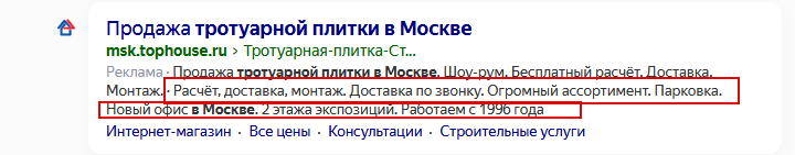 В дополнения можно включить информацию о ценах, акциях, скидках, зонах доставки или адресах офисов обслуживания, визитную карточку организации и другие данные, которые могут повлиять на решение клиента, но не умещаются в “прокрустово ложе” двух заголовков и текста рекламы в Яндексе.