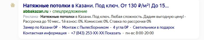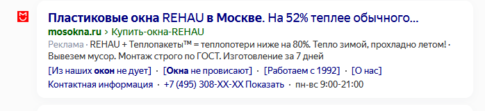 Вариант рекламного объявления с “быстрыми ссылками” без описаний: