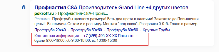 Контакты повышают доверие клиентов, привлекают внимание, стимулируют к звонкам пользователей, просматривающих рекламу на мобильных устройствах.