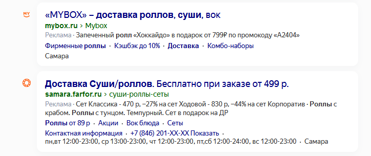 Очевидно, что объявление с изобилием дополнений занимает больше места в результатах поисковой выдачи и, благодаря этой увеличенной доле экрана, а также наличию не только буквенной, но и цифровой информации с разметкой, становится более заметным и привлекательным для пользователя.
