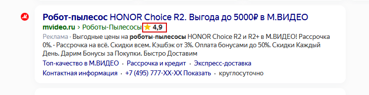 Еще один способ разнообразить вид объявления в результатах поисковой выдачи для повышения привлекательности — добавление данных из внешних источников. Например, рейтинг интернет-магазина на Яндекс.Маркете, который не только повышает доверие к рекламодателю со стороны клиентов, но и делает объявление заметным благодаря яркой желтой звездочке.