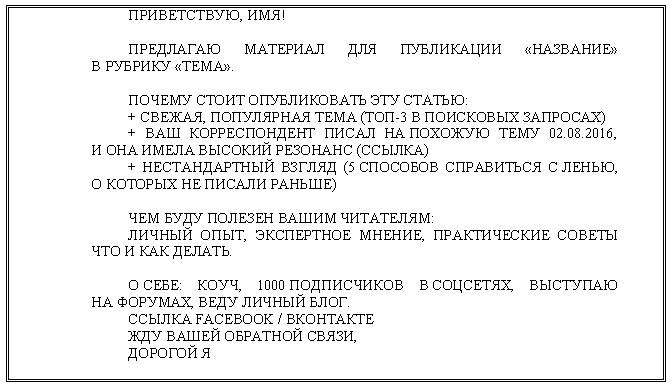 Итог: написание письма это целое искусство, овладев которым, вы сможете быстрее двигаться по карьерной лестнице и попадать в популярные интернет-издания. Кроме того этот навык пригодиться для привлечения целевой аудитории продукта по email-рассылке. Мы подготовили шаблон. Можете взять его как образец пока не наработаете свои тексты.
