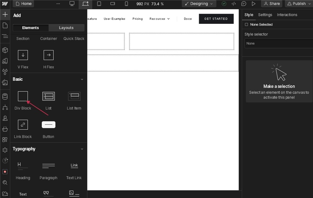 В библиотеке отсутствует слой шапка, поэтому придется создавать header вручную используя div. Для этого перейдем в раздел “Elements” и выберем div block.