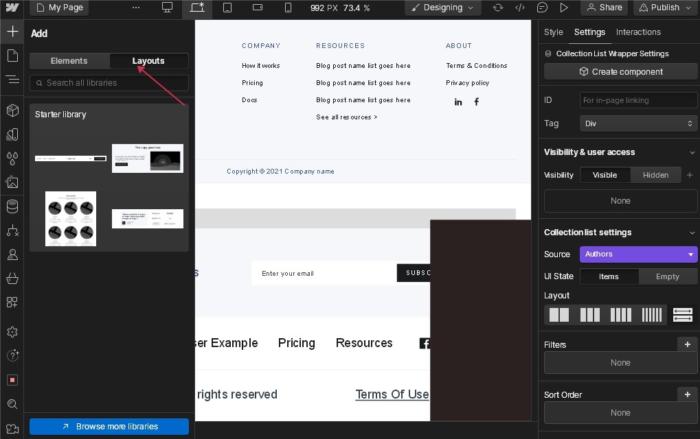 Сделаем тестовую страницу. В сервисе есть готовая коллекция слоев, где можно добавить панель навигации, цены, отзывы и многое другое. Рекомендуется использовать готовую библиотеку для быстрой разработки. Из чего будет состоять наша landing page: