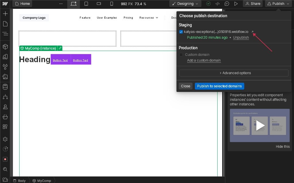 Когда веб-сайт готов, его можно опубликовать в интернете, для этого есть кнопка “Publish”. Процесс размещения веб-сайта состоит из несколько шагов: Подготовка, оптимизация HTML, CSS, упаковка всего и развертывание CDN. После того как все процессы буду завершены, сайт получит уникальный домен третьего уровня, в котором содержится имя владельца, идентификатор и названия конструктора.