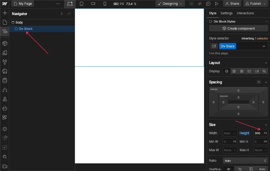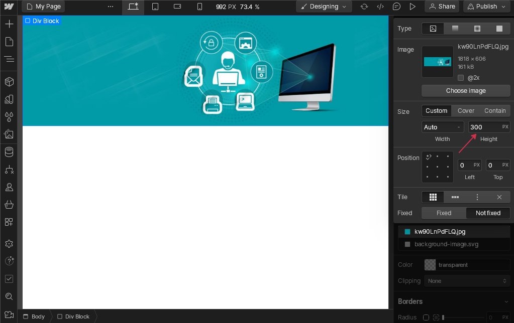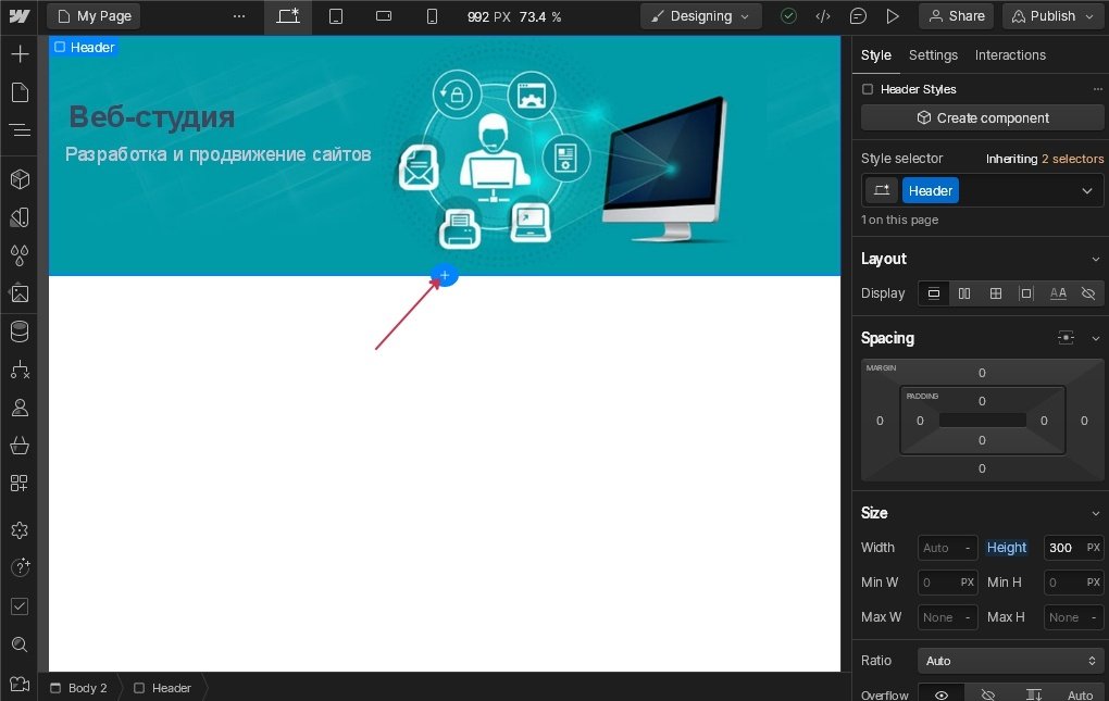 Новый контейнер это header, высота 300 пикселей. Рекомендуется заранее установить размер в настройках. При добавлении div никак не отображается в рабочей области, чтобы редактировать, перейдите в Navigator, щелкните по слою и установить Height 300, пример на картинке.