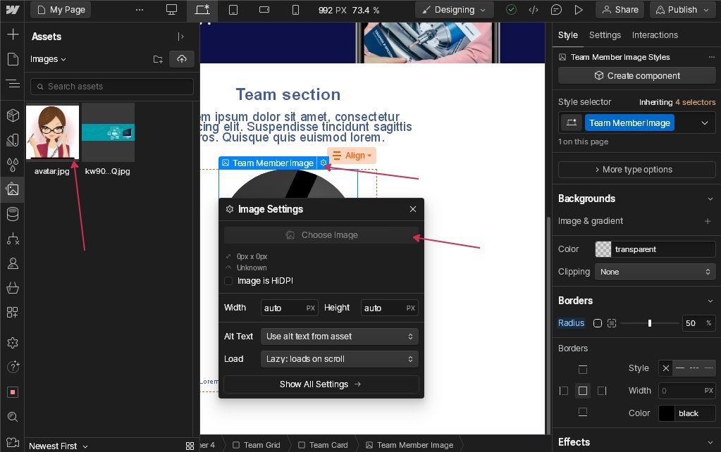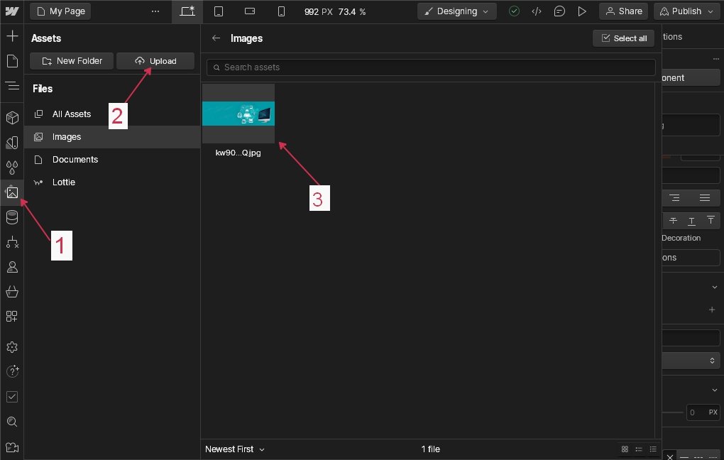 Дальше добавление картинки. Перейдите в категорию Assets, там хранятся пользовательские ассеты, картинки, которые будут встроены на сайт. Загрузка осуществляется через Upload или перетаскиванием в окно браузера. Добавим картинку по IT.