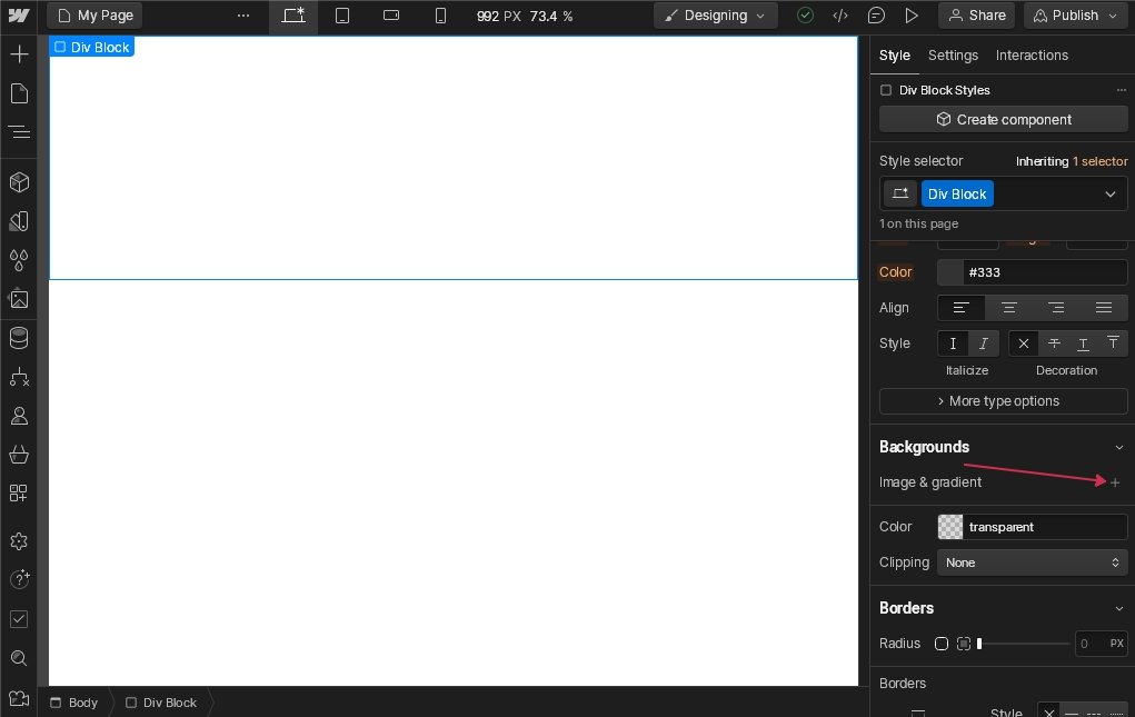 Когда загрузка завершится, размещаем изображение в div, выбираем контейнер и в настройках Background щелкаем на “плюс” рядом c Image & gradient.