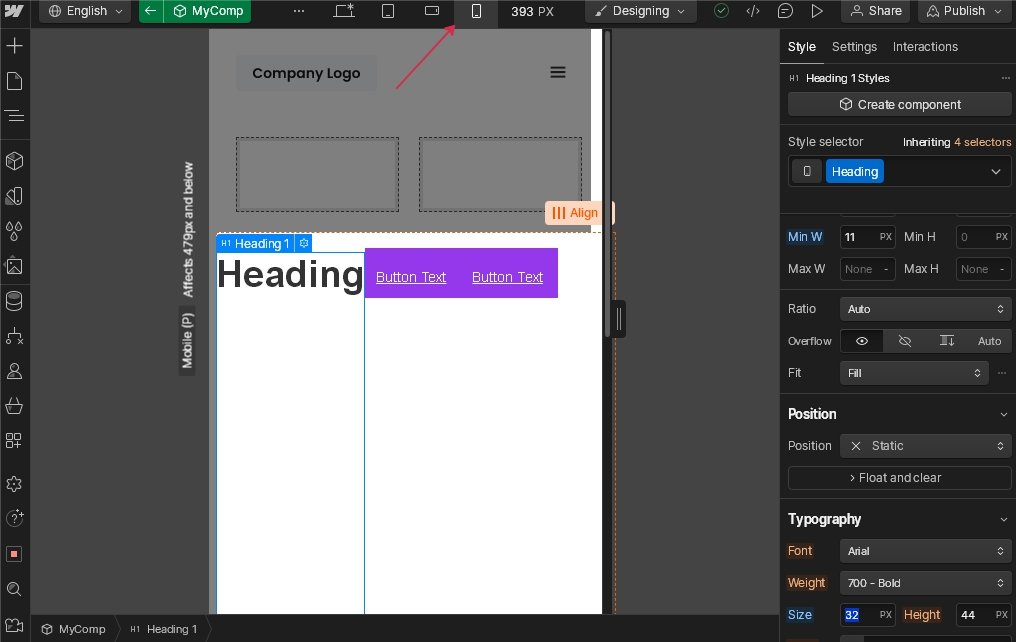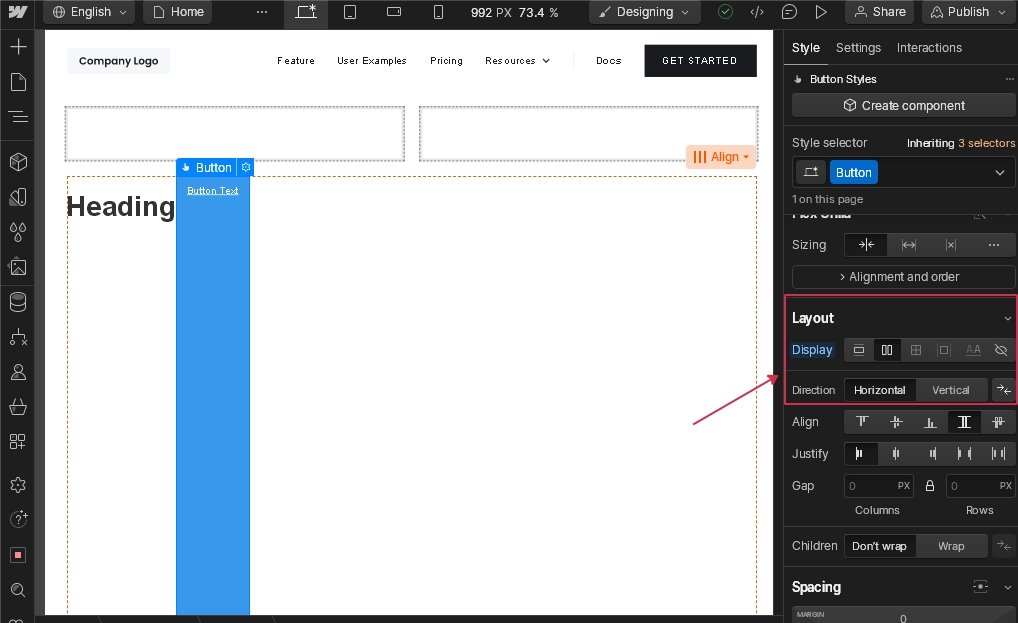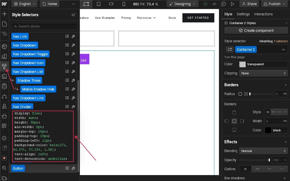 Класс позволяет работать быстрее и избегать однотипных действий. В Webfolow стили создаются по умолчанию, как только объект попадает на холст. Найти эти стили можно во вкладке Style Selectors, чтобы увидеть код, достаточно навести мышку на Selector.