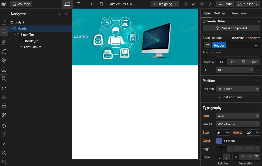 Как правило, страницы должны содержать какой-то текст, для этого в Webfolow есть типографика. Внесем текст. Все объекты будут расположены в выбранном контейнере.