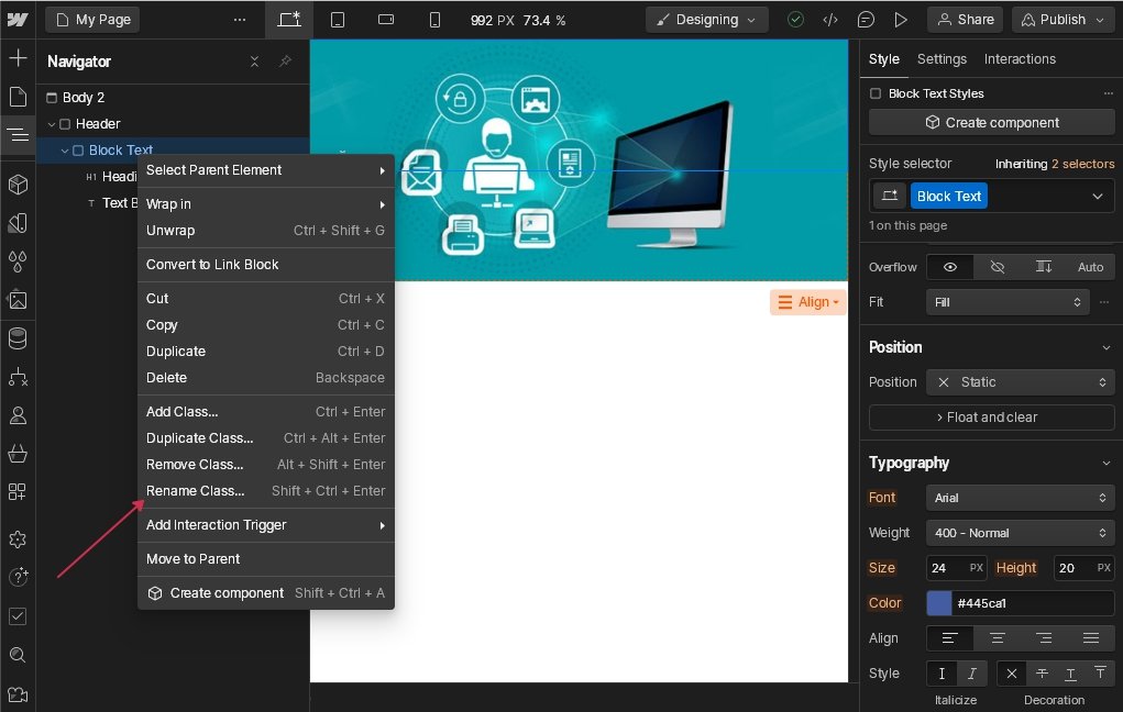 Обратите внимание, слои переименованы в Header и Block Text. Изменить название можно щелкнув правой кнопкой мыши по слою и выбрать из списка “Rename Class”.