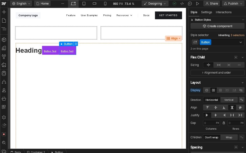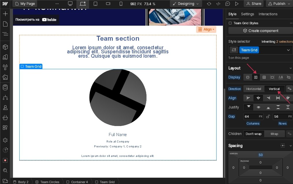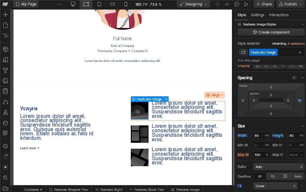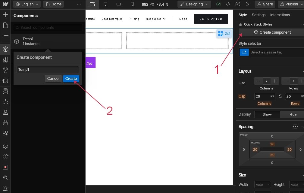 Классы позволяют многократно использовать стили, но компоненты могут поместить в себя целый контейнер со ссылками, кнопками, текстами с уже настроенными стилями. Чтобы создать такой компонент, нужно выбрать container и в панели нажать кнопку “Create Component”, во всплывающей панели придумать название и нажать Create.