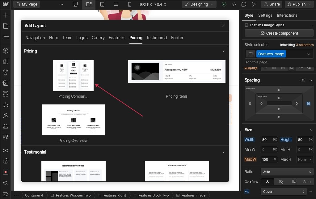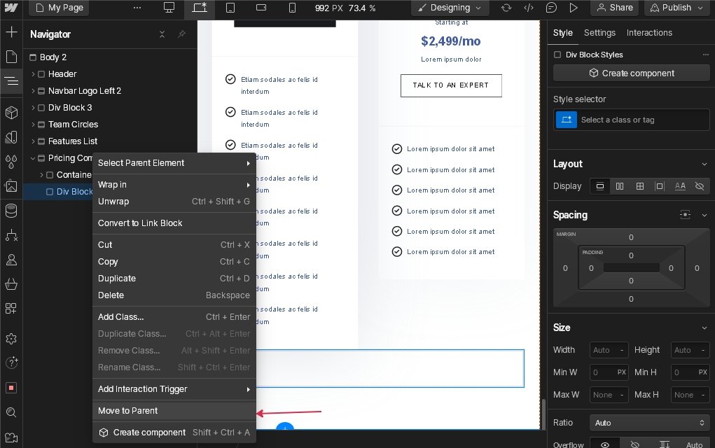 Перейдем к делу. Создадим контейнер. Чтобы новый div добавился в конец, нужно выбрать последний блок Pricing и нажать Div Block.