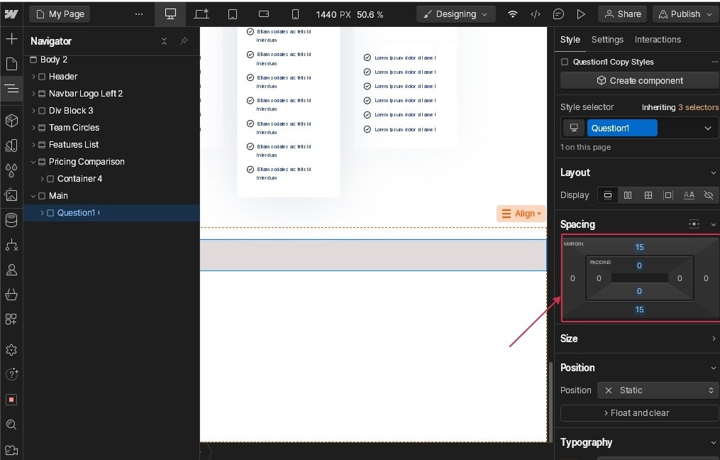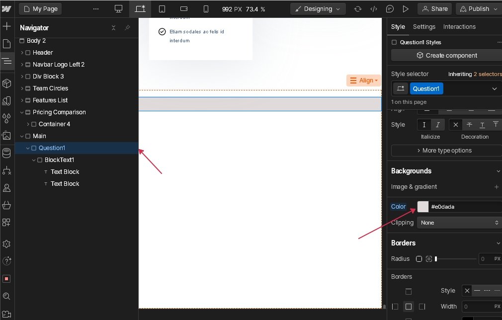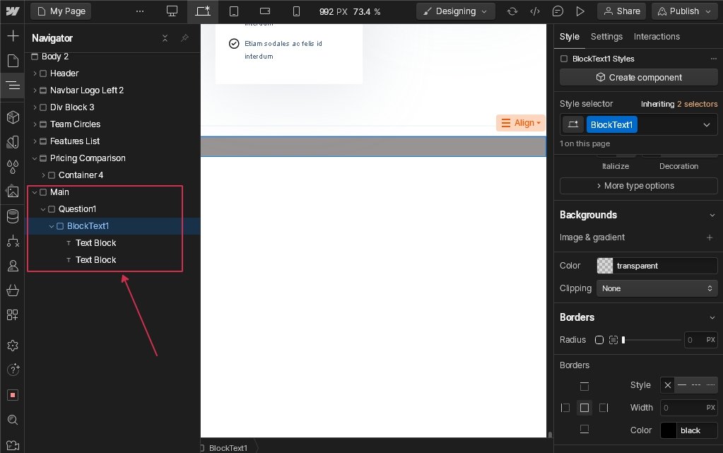 Main – главный блок Question1 – первый вопрос, позже этот блок сдублируем несколько раз. Если нужно добавить новый div-элемент в контейнер, то его сначала нужно выбрать. Лучше это делать во вкладке Navigation.