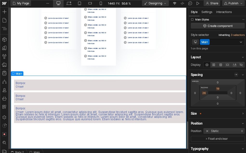 Установим размеры у главного(div) Height 600px и добавим еще один контейнер внутрь – это будет второй уровень, для которого можно поменять цвет, чтобы выделить текст. Третий уровень – это вопрос-ответ, здесь делаем отступы по отношению к родительскому второму уровню. Получается многоуровневая иерархия.