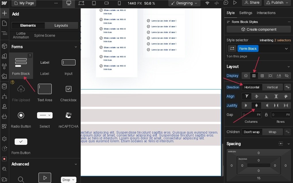 Когда клиент готов написать на почту, то ищет форму для обратной связи. Переходим в раздел Elements и “Form Block”. Настраиваем Style, как показано на скриншоте, таким образом разместим форму в центре.