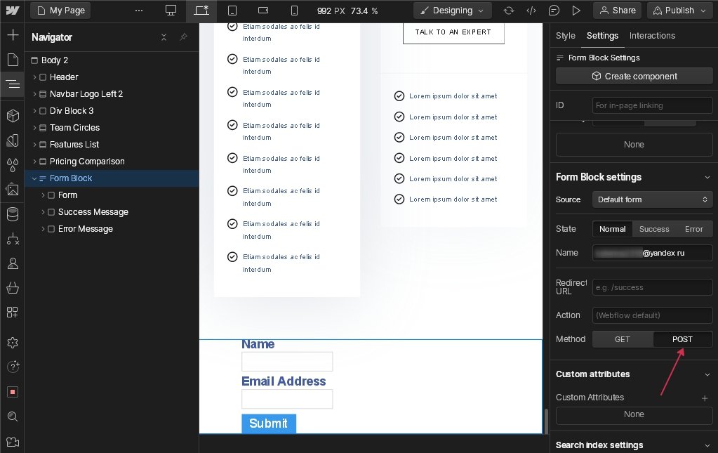 Вкладка Settings активирует настройки, которые сделают форму работающей. Здесь предлагается ввести почтовый ящик и метод отправки. Рекомендуем Post.