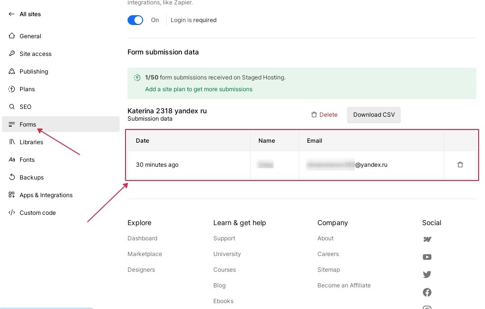 После всех настроек сайт можно опубликовать и протестировать ввести имя и email. Чтобы проверить отправку в левом углу нужно нажать на иконку и выбрать “Site settings”.