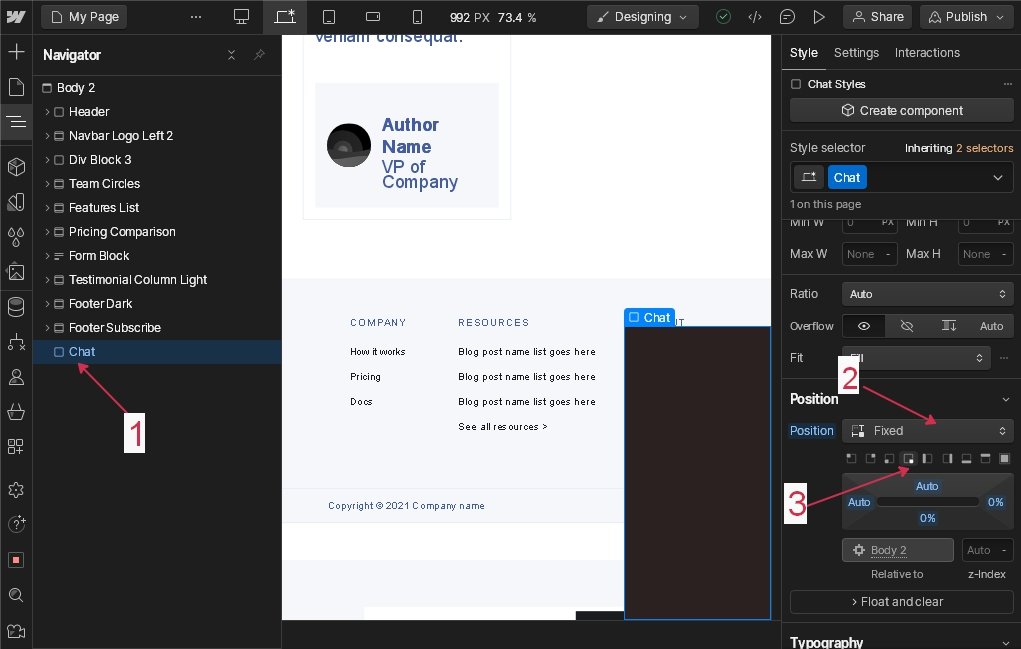 Чат нужен для быстрого получения рекомендаций. Обычно центр поддержки работает 24 часа, однако чаще отвечает робот, а операторы подключаются в случае трудных вопросов. Для добавления собственного чата нужно установить библиотеку. Чаще всего chat крепится сбоку, в правом углу и находится там, пока клиент прокручивает страницу. Добавим новый Div и сделаем Position “Fixed”. Слой нужно перенести в самый конец в панели Navigator, чтобы он находился поверх остальных слоев. Последовательность действий показана на картинке.