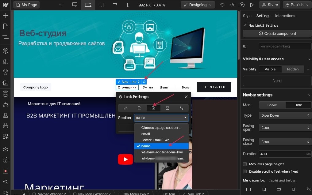 Проект почти готов остается только в меню навигации установить якорные ссылки. Делается это через Link Settings, всплывающее окно раздел Page Section, выбираем из списка якорь.