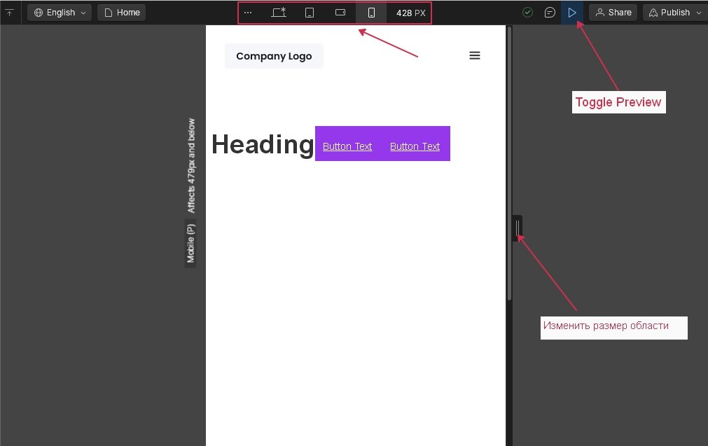 Следующая кнопка “Toggle Preview”, переходит в режим предпросмотра, т.е. как сайт видят пользователи. Лишние панели скрываются, остаются только верхние инструменты.